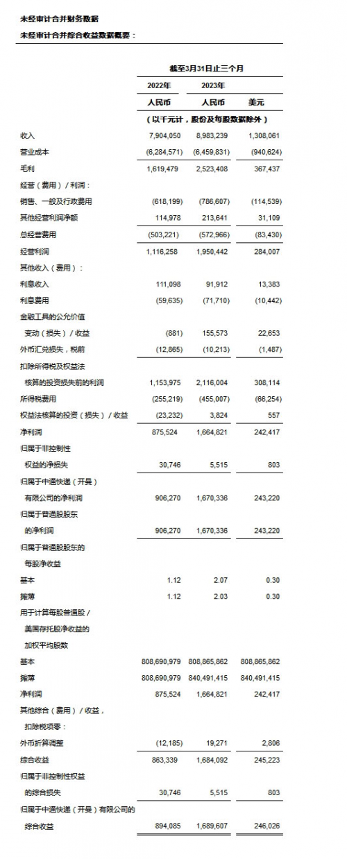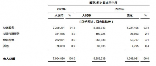?收入總額 為人民幣8,983.2百萬元(1,308.1百萬美元),較2022年同期的人民幣7,904.1百萬元增長13.7%。核心快遞服務收入較2022年同期增長16.1%,該增長是由于包裹量增長20.5%及單票價格下降3.7%的綜合影響所致。貨運代理服務收入較2022年同期減少41.8%,該減少主要是由于全球經(jīng)濟疲弱導致跨境電商需求和定價下降所致。物料銷售收入主要由打印電子面單所需的熱敏紙銷售收入組成,同比增長30.8%,該等增長與包裹量增長趨勢吻合。其他收入主要由金融貸款業(yè)務組成。