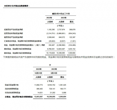 ? 經(jīng)營活動產(chǎn)生的現(xiàn)金凈額為人民幣2,738.0百萬元(398.7百萬美元),而2022年同期為人民幣1,105.4百萬元。