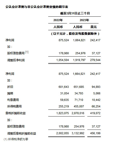 ? 歸屬于普通股股東的調(diào)整后基本及攤薄每股美國存托股收益[5]為人民幣2.38元(0.35美元)及人民幣2.33元(0.34美元),較2022年同期的人民幣1.34元及人民幣1.34元分別增長77.6%及73.9%。