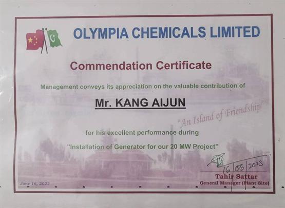 值得一提的是,發(fā)電機(jī)各項(xiàng)數(shù)據(jù)經(jīng)過業(yè)主檢測(cè)基本都在中間公差,巴基斯坦OLYMPIA CHEMICALS公司管理層對(duì)舜云互聯(lián)提供的服務(wù)和售后服務(wù)人員所展現(xiàn)出的精湛的技術(shù),高度的責(zé)任感和使命感表示高度認(rèn)可,并頒發(fā)了《表?yè)P(yáng)證書》。
