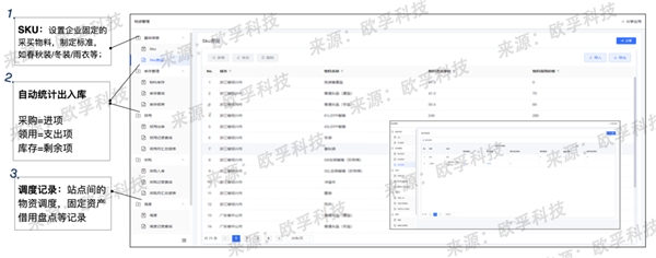 歐孚科技運(yùn)用低代碼技術(shù)搭建了“物資進(jìn)-出項(xiàng)“管理模塊。該模塊包括搭建SKU庫(kù),對(duì)物資物料進(jìn)行統(tǒng)一定義;配置采購(gòu)調(diào)度的表單公式,使區(qū)域站點(diǎn)能根據(jù)實(shí)際領(lǐng)用情況進(jìn)行填寫;根據(jù)各站點(diǎn)領(lǐng)用數(shù)據(jù),快速統(tǒng)計(jì)物料成本并進(jìn)行庫(kù)存盤點(diǎn)管理。