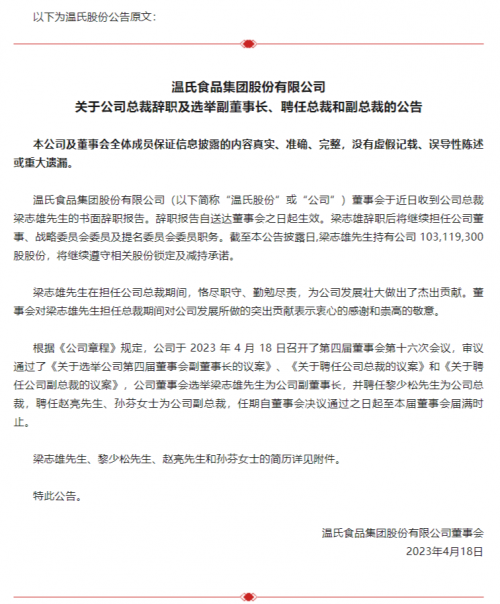 4月18日,溫氏股份第四屆董事會第十六次會議順利召開,會議由溫氏股份董事長溫志芬主持,全體董事參加會議,監(jiān)事列席。經(jīng)記名投票表決,會議審議通過了《關(guān)于選舉公司第四屆董事會副董事長的議案》《關(guān)于聘任公司總裁的議案》和《關(guān)于聘任公司副總裁的議案》三項議案。根據(jù)表決結(jié)果,梁志雄先生當選公司副董事長,聘任黎少松先生為公司總裁,聘任趙亮先生、孫芬女士為公司副總裁,任期自董事會決議通過之日起至本屆董事會屆滿時止。