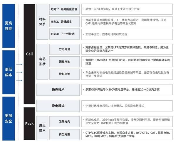 材料從根本上決定著電池性能。通過改進材料提高電池性能、優(yōu)化電池老化機制、應(yīng)用新型材料、改變電芯結(jié)構(gòu)是電芯研發(fā)的主要方向。 例如,材料體系方面,采用新型材料體系(高鎳正極、硅基負極、鋰金屬負極、固態(tài)電解質(zhì)等),提高單體能量密度;或者研制出磷酸錳鐵鋰,探索鈉離子電池的商業(yè)化應(yīng)用,降低成本;或者加快固態(tài)電池的研發(fā)進程,使電池性能更高,更耐久。電芯形狀方面,方形電池,尤其是LFP短刀兼顧性能、集成與制造,成為主流企業(yè)的優(yōu)選方案之一;大圓柱電池也是熱門方向,特斯拉和寶馬均已提出具體的實施規(guī)劃??斐浼夹g(shù)方面,多家主機廠開始導(dǎo)入800V高電壓平臺,并聯(lián)合電池企業(yè)推出2C~4C快充方案。