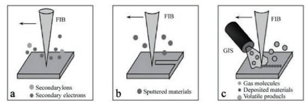 FIB-SEM示意圖,與聚焦離子束的三種工作模式 a.成像;b.加工;c.沉積 來源:蔡司,NE時代整理