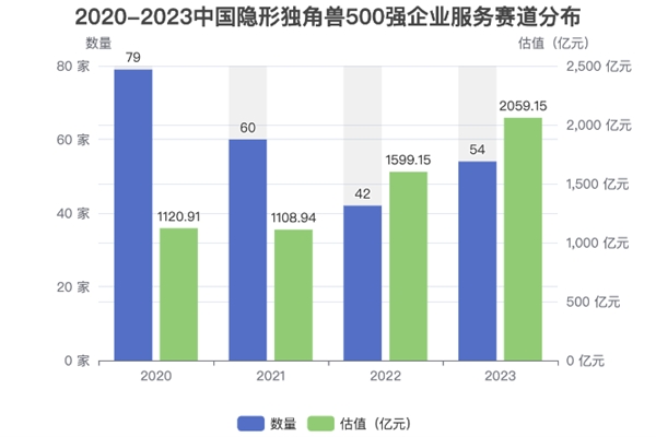 報告顯示,2023中國隱形獨角獸500強企業(yè)服務賽道獨角獸企業(yè)有54家,估值合計為2059.15億元(如上圖)。根據BIHU創(chuàng)業(yè)伯樂獨角獸企業(yè)數據庫(EMUDB),2021-2023中國隱形獨角獸500強企業(yè)服務賽道隱形獨角獸企業(yè)同比分別減少19家、減少18家、增加12家;企業(yè)服務賽道隱形獨角獸企業(yè)估值合計同比分別降低1.07%、增長44.21%、增長28.77%。2023年與2022年相比,企業(yè)服務賽道隱形獨角獸企業(yè)從42家上漲到54家,增加了12家,漲幅為28.57%,呈現出上升趨勢;估值合計從1599.15億元上漲到2059.15億元,增長了460億元,漲幅為28.77%,呈現出上升趨勢。
