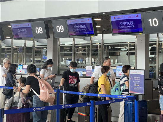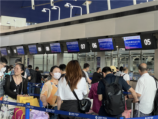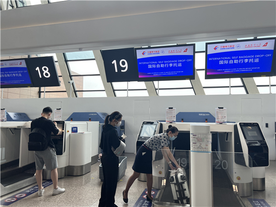 暑運期間客流上升,東航充分發(fā)揮上海虹橋、浦東兩場候機樓國內(nèi)、國際值機區(qū)自助值機設(shè)備和自助行李托運設(shè)備作用,在客流高峰時段,對排長隊的旅客進行分流。