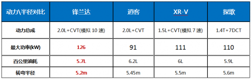 綜合幾款車的動(dòng)力參數(shù)對比,可以發(fā)現(xiàn)在賬面數(shù)據(jù)上,鋒蘭達(dá)的動(dòng)力表現(xiàn)明顯更有優(yōu)勢,得益于這款2.0L發(fā)動(dòng)機(jī)的排量優(yōu)勢,其最大功率達(dá)到126kW,不管是與探歌的1.4T發(fā)動(dòng)機(jī),還是排量相同的逍客2.0L發(fā)動(dòng)機(jī),鋒蘭達(dá)都有著明顯的動(dòng)力優(yōu)勢。