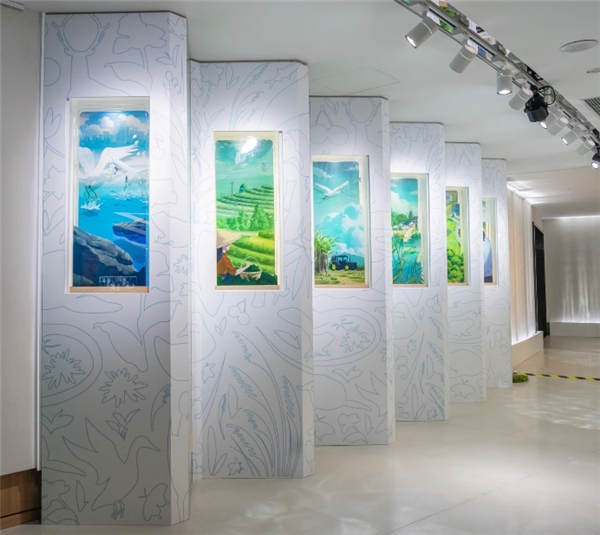 展覽以“水”的不同狀態(tài)為線索,串聯各個主題區(qū)域,包括沉浸式光影體驗的【水影】長廊、集合水域場景及可口可樂中國水資源保護項目插畫的【匯聚】區(qū)域、講述水與人和自然生態(tài)之間故事的【流變】區(qū)域和陳列紀念周邊的【流念】區(qū)域,引領觀眾走入“水”的世界,探索人與水的交織共生。