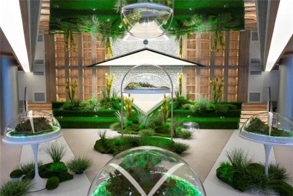中心生態(tài)景觀區(qū)借助生態(tài)球以微縮景觀的形式呈現水孕育出的生態(tài)環(huán)境