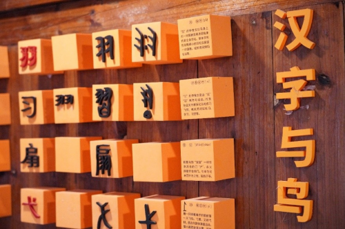 在這個書屋中,項目團隊別出心裁地規(guī)劃了一個叫“漢字與鳥”的板塊,包含了從甲骨文到現(xiàn)代所有與鳥相關(guān)的漢字。緊鄰這個板塊的墻上是一整排純手工制作的傳統(tǒng)卷軸,里面寫滿了與鳥相關(guān)的千古名句。位于大廳正中央的是一幅巨型馬影湖手繪地圖,上面標(biāo)注著當(dāng)?shù)刂饕暮蝤B種類,供參觀者學(xué)習(xí)。