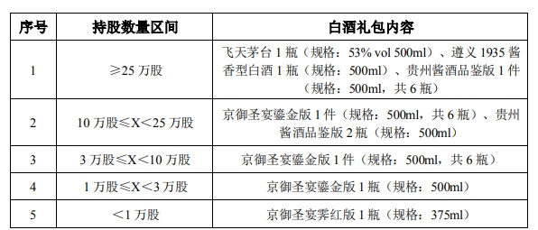 根據(jù)活動(dòng)安排,吉宏股份持股25萬股以上的股東收到的白酒禮包將包括:飛天茅臺(tái)1瓶(規(guī)格:53%?vol?500ml)、遵義1935醬香型白酒1瓶(規(guī)格:500ml)、貴州醬酒品鑒版1件(規(guī)格:500ml,共6瓶)。