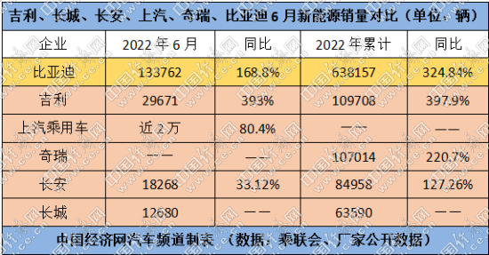 中國(guó)經(jīng)濟(jì)網(wǎng)記者通過(guò)梳理廠家公開(kāi)的數(shù)據(jù)和乘聯(lián)會(huì)發(fā)布的數(shù)據(jù)發(fā)現(xiàn),6月,比亞迪乘用車、吉利、長(zhǎng)安乘用車、長(zhǎng)城的銷量分別為133762輛、126595輛、118303輛、101186輛,同比分別上漲168.8%%、26%、37.6%、0.52%;上半年累計(jì)銷量分別為641350輛、613842輛、629175輛、518525輛,同比分別上漲314.9%、-3%、-4.61%、-16.12%。?