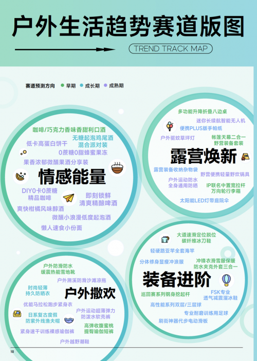 巨量算數(shù) & 算數(shù)電商研究院綜合趨勢(shì)賽道評(píng)估模型,篩選出了 38 個(gè)戶(hù)外生活行業(yè)趨勢(shì)賽道,覆蓋運(yùn)動(dòng)用品、戶(hù)外用品、箱包、方便食品、酒飲等多板塊,我們認(rèn)為推動(dòng)品類(lèi)的創(chuàng)新力集中在功能創(chuàng)新、場(chǎng)景創(chuàng)新和情感創(chuàng)新。