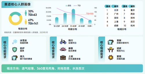 防曬衣賽道解讀:搜索量同比增長(zhǎng) 161.4%,遠(yuǎn)高于行業(yè)整體,該賽道上半年搜索量逐漸上升,下半年搜索量逐漸下降,6月份搜索量最高。興趣群體以女性為主,31-40 歲人群占比高,用戶(hù)集中在一線(xiàn)和高溫天氣多發(fā)城市。未來(lái),防曬衣可能會(huì)更加注重輕盈防曬、持久等功能,為消費(fèi)者提供更好的防護(hù)和穿著體驗(yàn),并向輕薄、智能等方向發(fā)展。