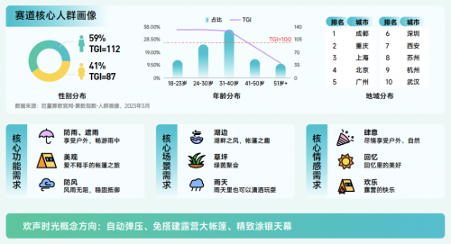 帳篷賽道解讀:該賽道抖音2022年搜索量同比增長(zhǎng)228.6%,遠(yuǎn)高于行業(yè)整體水平。該賽道的興趣群體以 31-40 歲的男性為主,主要分布地區(qū)涵蓋多個(gè)熱門(mén)旅游城市。隨著生活水平的提高和對(duì)自然休閑需求的增加,多功能帳篷在未來(lái)將更受歡迎,防雨、美觀和防風(fēng)等多重特性將滿(mǎn)足人們對(duì)于舒適和便利的需求。除此之外,在技術(shù)創(chuàng)新、多樣化產(chǎn)品、個(gè)性化定制、環(huán)??沙掷m(xù)發(fā)展等趨勢(shì)上,這一領(lǐng)域?qū)⒂袕V闊的市場(chǎng)前景。