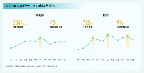 2022年戶(hù)外生活相關(guān)內(nèi)容在抖音上的受歡迎程度持續(xù)增長(zhǎng),月均播放量高達(dá) 2041 億次,同比增長(zhǎng) 42%。除短視頻種草外,用戶(hù)主動(dòng)搜索戶(hù)外生活內(nèi)容的意愿也更加強(qiáng)烈,月均搜索量達(dá)到 725 萬(wàn)次,同比增長(zhǎng) 99%。
