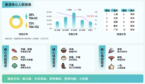 方便食品賽道解讀:2022年3月-2023年4月間搜索量同比增長(zhǎng) 829.6%,遠(yuǎn)高于行業(yè)整體,月度趨勢(shì)波動(dòng)攀升。女性為主,31-40 歲人群占比高;集中在一二線(xiàn)城市。方便食品由于其便宜、快速和方便,逐漸成為出行必備品。正所謂,方便生活,小包裝,大營(yíng)養(yǎng)。在戶(hù)外出行中,方便食品助你享受更加自由、無(wú)拘束的旅程。