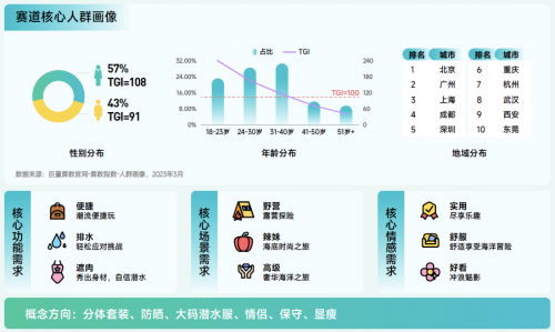 沖浪賽道解讀:2022年搜索量同比增長(zhǎng)100.7% 。用戶(hù)以男性為主,集中在北上廣一線(xiàn)城市。24-40 歲人群對(duì)沖浪潛水更感興趣。相對(duì)來(lái)說(shuō),對(duì)于沖浪潛水用戶(hù)更注重便捷、排水等功能。未來(lái),隨著技術(shù)的發(fā)展和人們對(duì)海洋環(huán)境保護(hù)意識(shí)的增強(qiáng),沖浪運(yùn)動(dòng)將更加注重舒適、安全和環(huán)保,并可能推出更具創(chuàng)新性的裝備,產(chǎn)生新的活動(dòng)形式。