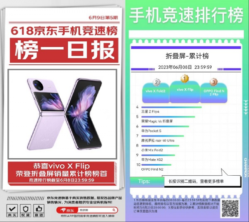 最近京東618火熱進(jìn)行中,囤完日用品,也該將自己卡頓或拍攝性能落后的手機(jī)換新了。除了性能出色的直板智能機(jī),還可以選擇嘗鮮,換新折疊屏手機(jī)試試。不過很多人都表示自己平時(shí)也不關(guān)注手機(jī)圈的事情,配置也就看個(gè)大概,不知道怎么選。沒關(guān)系,京東618推出了手機(jī)競(jìng)速排行榜,京東APP搜索“競(jìng)速榜”即可進(jìn)入,不同喜好和預(yù)算都能選到適合的產(chǎn)品,其中就有折疊屏手機(jī)銷量累計(jì)榜。截至6月8日,vivo X Flip、vivo X Fold2、OPPO Find N2 Flip成為折疊屏手機(jī)銷量累計(jì)榜TOP3,下面就帶大家一起看看這些在榜折疊屏手機(jī)。