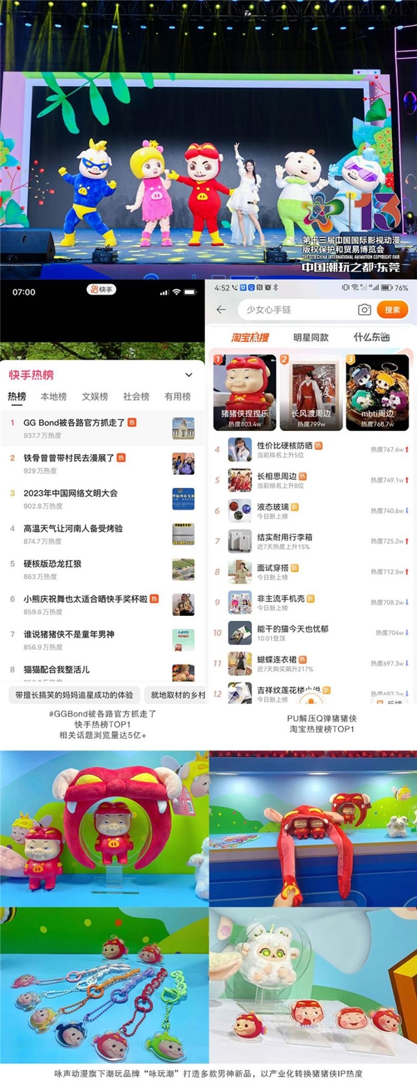 本次展會上,豬豬俠率領(lǐng)小伙伴們亮相國漫國潮嘉年華,精彩的現(xiàn)場表演吸引了眾多觀眾圍觀。今年,豬豬俠表情包在各大平臺高頻次曝光,眾多網(wǎng)友以自發(fā)模仿、二創(chuàng)等方式傳播GGBond表情包,男神GGBond相關(guān)話題多次登上抖音、快手、微博等各平臺熱榜。同時,詠聲動漫迅速推出相應(yīng)衍生品承接熱點(diǎn),實(shí)現(xiàn)營銷變現(xiàn)。