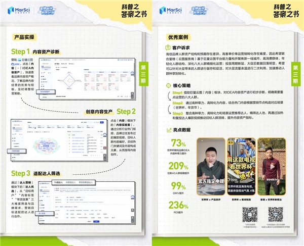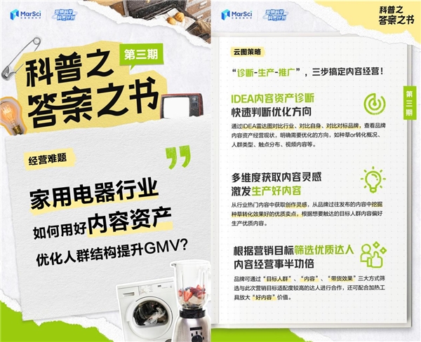 本期的「科普之答案之書」正是以家用電器行業(yè)為案例,結(jié)合巨量云圖「內(nèi)容」 和「達人營銷」 模塊的產(chǎn)品能力,從內(nèi)容資產(chǎn)診斷、創(chuàng)意內(nèi)容生產(chǎn)、適配達人篩選一步步指導(dǎo)商家如何用好內(nèi)容資產(chǎn)、優(yōu)化人群結(jié)構(gòu)來提升GMV。