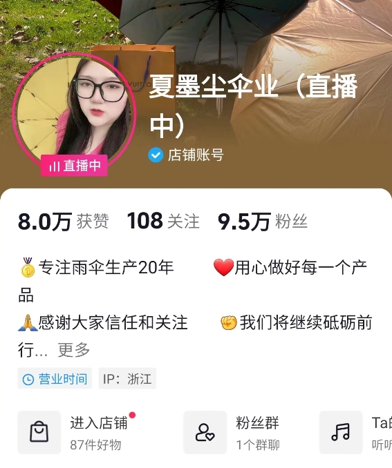 當自家店鋪成為網(wǎng)紅店,讓沒做電商的鐘永平有了新的想法。于是,在2020年5月,他決定入局抖音,并取名“夏墨塵傘業(yè)”。