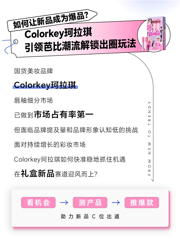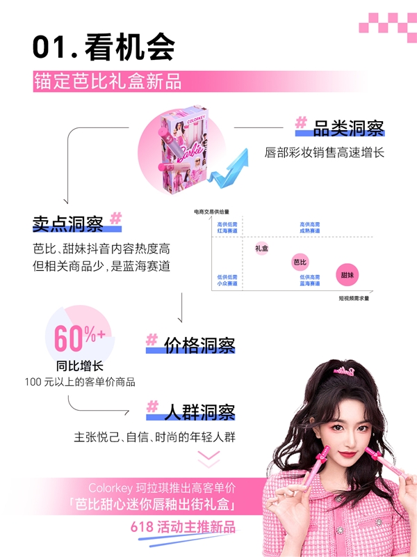 適用于送禮、提升品牌調(diào)性、具有高客單價(jià)特征的“芭比禮盒”新品,符合品牌風(fēng)格特點(diǎn)和消費(fèi)需求,適宜作為品牌形象款進(jìn)行主推和破圈?;诖?珂拉琪打造高客單價(jià)“芭比甜心迷你唇釉出街禮盒”作為618活動(dòng)的主推新品,強(qiáng)力吸引目標(biāo)人群。
