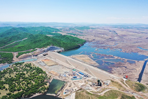 內(nèi)蒙古引綽濟遼工程加緊推進(jìn)。圖為引綽濟遼工程文得根水利樞紐施工現(xiàn)場。新華社記者 劉磊 攝