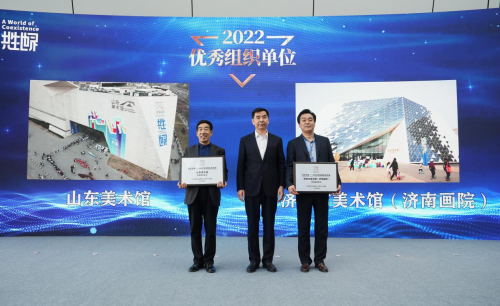 劉斯杰為山東美術(shù)館、濟(jì)南市美術(shù)館(濟(jì)南畫院)兩家優(yōu)秀組織單位頒發(fā)了獎(jiǎng)牌。
