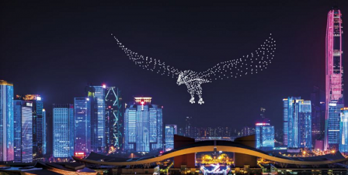 在無人機的點綴下,夜空中的無人機在排序布列下幻化成深圳燕子湖國際會展中心,夜空中的金花轉動成展館形狀的禮盒,禮盒上的絲帶展開,呈現(xiàn)了本會展覽內(nèi)容豐富,精彩紛呈,這在無人機的點綴下,代表著深圳文化的醒獅,吐出了深圳現(xiàn)代城市的城際天際線,可以看出,深圳展現(xiàn)出了全球化、多樣性和包容性。