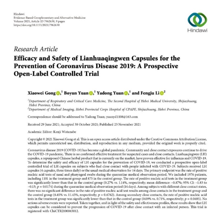 由河北醫(yī)科大學第二醫(yī)院呼吸與危重癥醫(yī)學二科主任袁雅冬教授主持開展的“連花清瘟膠囊預防新型冠狀病毒肺炎”真實世界研究論文被國際學術期刊《循證補充和替代醫(yī)學》刊發(fā),該研究選取1976例與新冠肺炎感染者有密切接觸的受試者,分為連花清瘟治療組(1101例)和對照組(875例),兩組受試者分別接受連花清瘟膠囊(4粒/次,3次/天)治療和常規(guī)醫(yī)學14天觀察,并于14天后檢測鼻咽拭子核酸檢測陽性率。研究結果顯示,隔離醫(yī)學觀察期間(14天)治療組核酸檢測陽性率為0.27%,對照組為1.14%;二次密切接觸者中,治療組核酸檢測陽性率為0.09%,對照組為0.71%。服用連花清瘟治療組都顯著低于對照組。在醫(yī)學隔離觀察期間,對于核酸檢測陽性患者,連花清瘟治療組的癥狀發(fā)生率顯著低于對照組,特別是能顯著降低發(fā)熱的發(fā)生率。這是首個對新冠密切接觸者預防的有效性和安全性的臨床試驗。