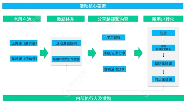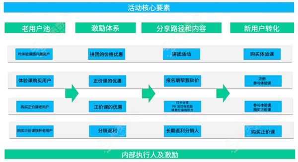 激勵(lì)體系:激勵(lì)體系是活動(dòng)“玩”起來的核心。確定激勵(lì)物是什么需要考慮和業(yè)務(wù)、目標(biāo)的貼合度,同時(shí)也需要考慮成本。比如素質(zhì)教育喜歡用課時(shí)來獎(jiǎng)勵(lì)購買正價(jià)課的老用戶,或是給予虛擬幣用來購買周邊;職業(yè)教育喜歡拼團(tuán)給予低價(jià)體驗(yàn)課,為正價(jià)課的轉(zhuǎn)化埋伏筆。對(duì)于公司具體應(yīng)該給用戶什么激勵(lì)這件事兒,我們建議本著不重復(fù)造輪子的原則,先參考同行,再根據(jù)效果成本進(jìn)行迭代。