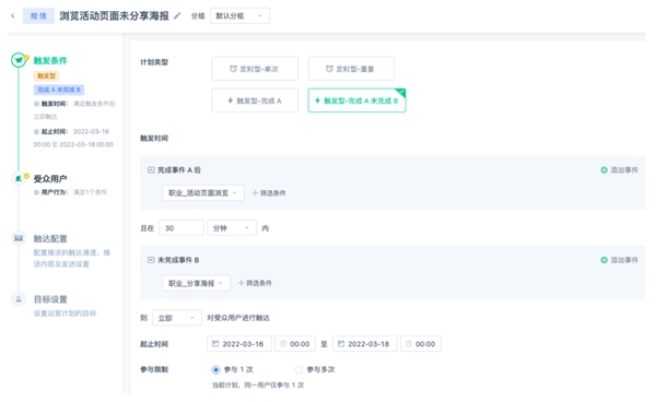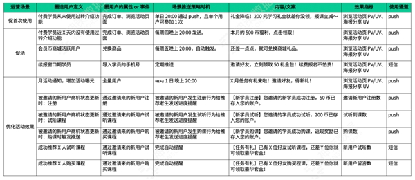 我們梳理了三種運(yùn)營場景,對(duì)于未參與過轉(zhuǎn)介紹活動(dòng)的用戶可以促其首次使用;對(duì)于之前參與過但近期未參與的用戶進(jìn)行促活;對(duì)于完成階段性目標(biāo)的老用戶進(jìn)行觸達(dá)提醒,來優(yōu)化活動(dòng)的效果,如下表所示: