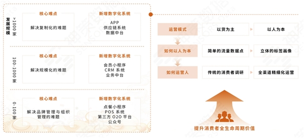 2、在實現(xiàn)消費者全生命周期價值運營時,不同規(guī)模的連鎖餐飲品牌需關(guān)注不同的重點:小而美的企業(yè)聚焦數(shù)字化鏈條前端板塊,規(guī)模化的企業(yè)更聚焦雙中臺的搭建。