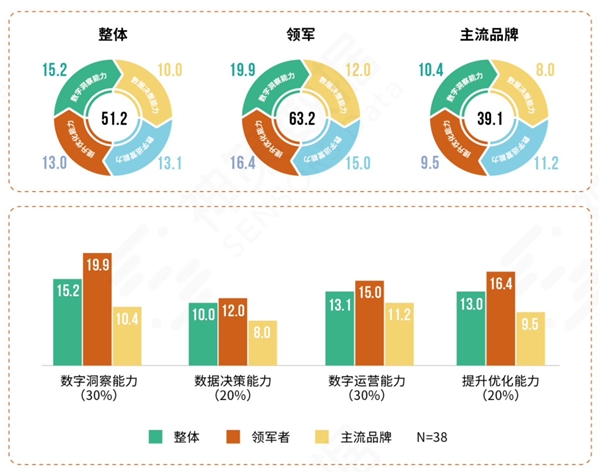 國貨連鎖餐飲品牌的數(shù)字化營銷能力處于中游水平,各領(lǐng)域均有較大提升空間,從細項上來看,國貨連鎖餐飲在【數(shù)據(jù)決策能力】得分略低,應(yīng)重點加強;領(lǐng)軍者在模型各方面均較領(lǐng)先,其中【數(shù)字洞察能力】和【數(shù)字運營能力】是關(guān)鍵;主流品牌的數(shù)字化營銷能力還偏弱,各領(lǐng)域的建設(shè)力度均不夠。