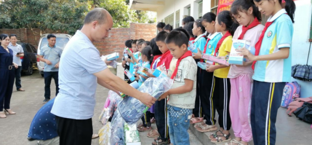 雙蟻藥業(yè)副總經(jīng)理王洪向留守困境兒童分發(fā)學習用品