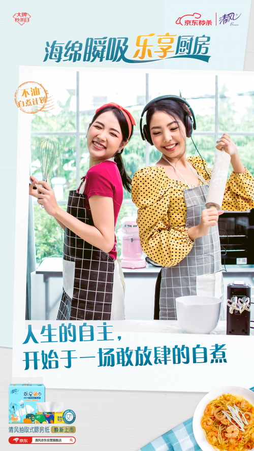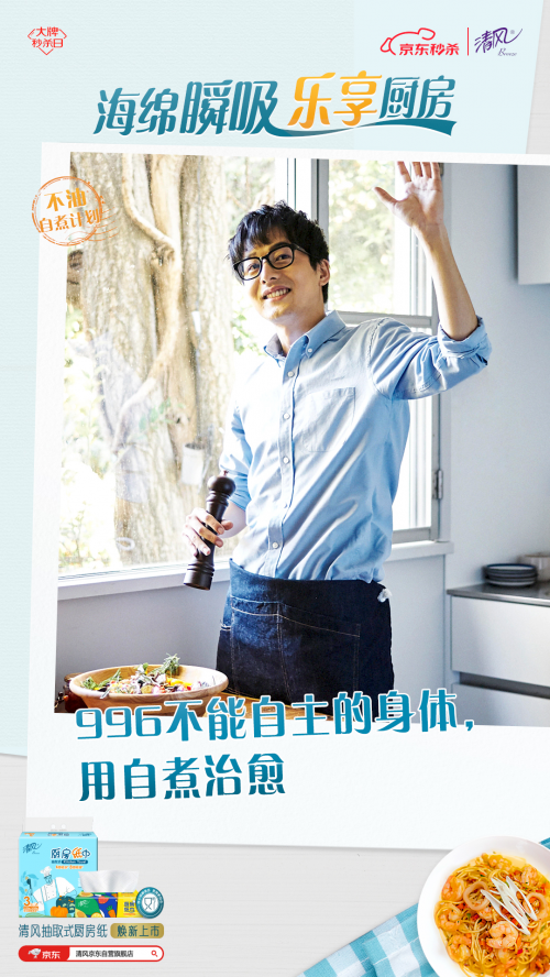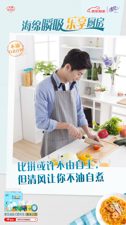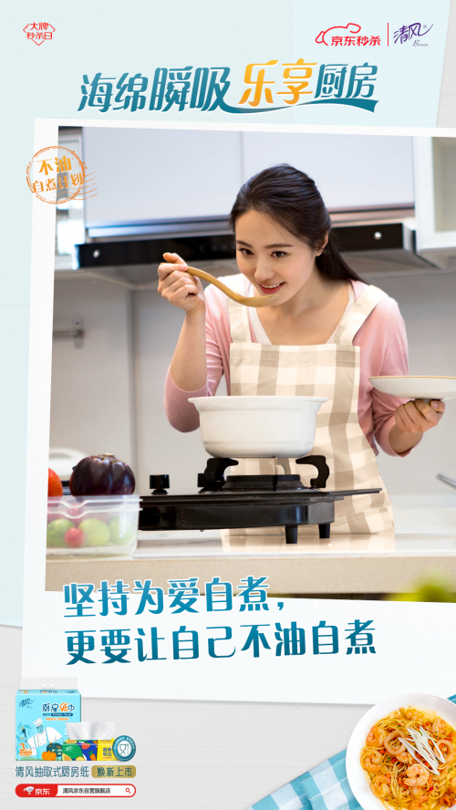 為此,清風(fēng)推出“不油自煮計(jì)劃”, 以煥新上市的清風(fēng)海綿吸廚房紙巾為依托,用“一抹即凈”的不油體驗(yàn)和“一掃就會(huì)”的自煮攻略,幫助用戶(hù)破除廚房恐懼,給不同身份的用戶(hù)輕松自煮不油膩的廚房體驗(yàn),讓TA們能不由自主地愛(ài)上烹飪,輕松享受做飯帶來(lái)的快樂(lè)。