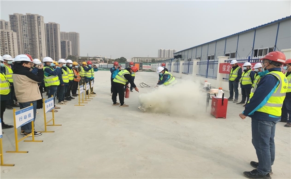 最后,在現(xiàn)場開展模擬火災(zāi)救援演練,項(xiàng)目管理人員與施工作業(yè)人員進(jìn)行現(xiàn)場滅火實(shí)操演練。