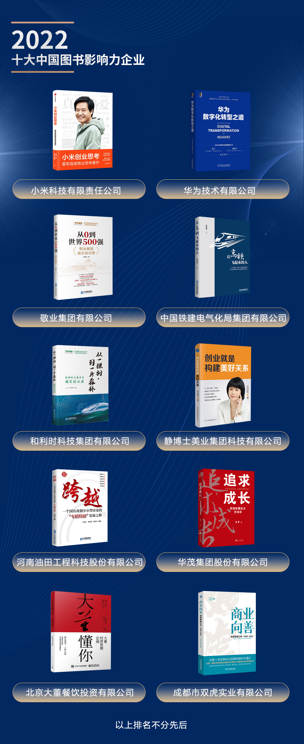獲得“2022十大中國圖書影響力企業(yè)”,上榜企業(yè)包括:小米、華為、敬業(yè)、和利時、靜博士、華茂、大董、雙虎、中國鐵建電氣化局、河南油田工程科技等。
