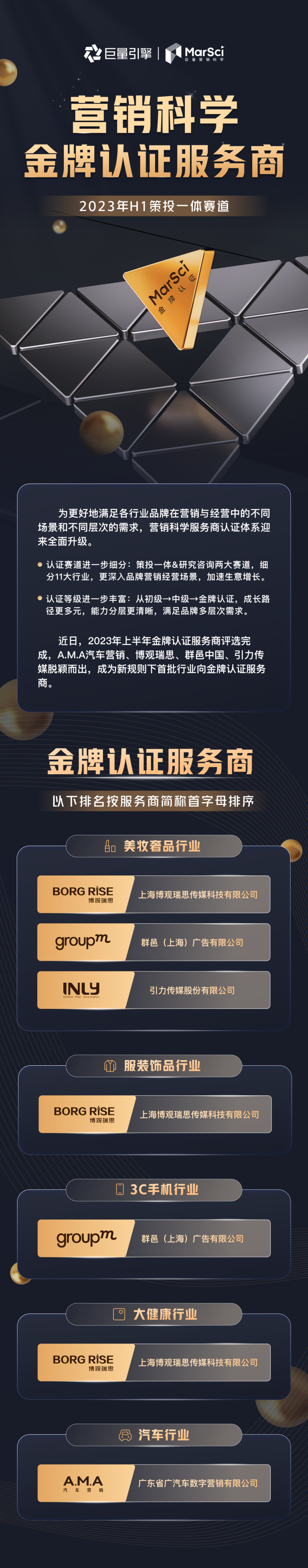 注:除金牌認證服務(wù)商外,營銷科學(xué)服務(wù)生態(tài)基于全新規(guī)則,對現(xiàn)有生態(tài)服務(wù)商重新進行了等級評定和認證周期授予,評選出了2023年首批初級和中級認證服務(wù)商。