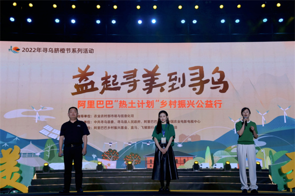 客家韻、紅土風(fēng)、東江源、橘鄉(xiāng)情,尋烏不尋常!11月21日晚,2022年尋烏臍橙節(jié)系列活動(dòng)之阿里巴巴“熱土計(jì)劃”鄉(xiāng)村振興公益行—益起尋美到尋烏系列活動(dòng),在江西省尋烏縣客家小鎮(zhèn)音樂(lè)噴泉廣場(chǎng)盛大舉行。本次活動(dòng)由農(nóng)業(yè)農(nóng)村部市場(chǎng)與信息化司指導(dǎo),中共尋烏縣委、尋烏縣人民政府、阿里巴巴公益、中國(guó)農(nóng)業(yè)電影電視中心主辦;阿里巴巴鄉(xiāng)村振興基金、盒馬、飛豬旅行、《鄉(xiāng)約》欄目共同承辦。