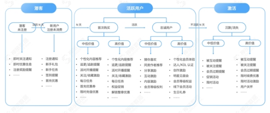 沉默&流失期,需要對高流失風(fēng)險客戶深度洞察,進行流失用戶召回。一般可以用熱門內(nèi)容Push進行站內(nèi)/站外召回。因為用戶流失是一個過程,不是一個節(jié)點,用戶流失之后再召回很難100%召回,所以要在用戶流失前,進行有效觸達,防止或者延緩用戶流失,并且召回要有周期性,進行多次召回?zé)o果的用戶可自動標(biāo)記為無價值/流失用戶。