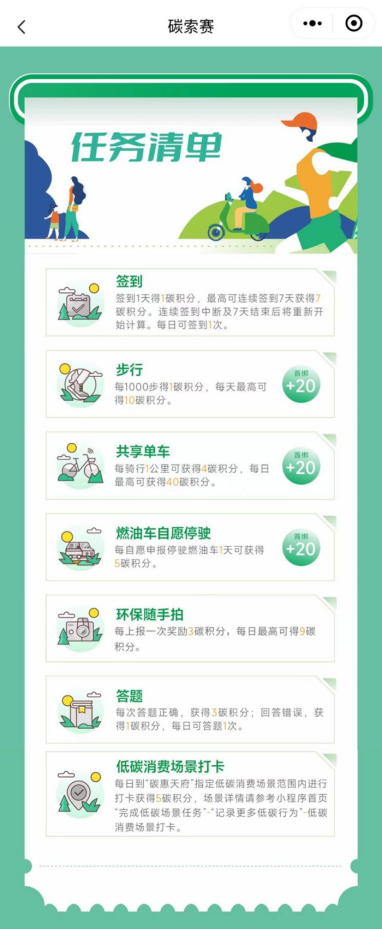 “出行碳索賽”作為亮點(diǎn)活動(dòng)之一,更是讓人眼前一亮。10日25日起,通過(guò)微信進(jìn)入“碳惠天府”小程序,踐行包括每日步行、騎共享單車、自愿停駛?cè)加蛙?、環(huán)保隨手拍、低碳消費(fèi)場(chǎng)景打卡等多種綠色低碳任務(wù),均能獲得相應(yīng)的碳積分。
