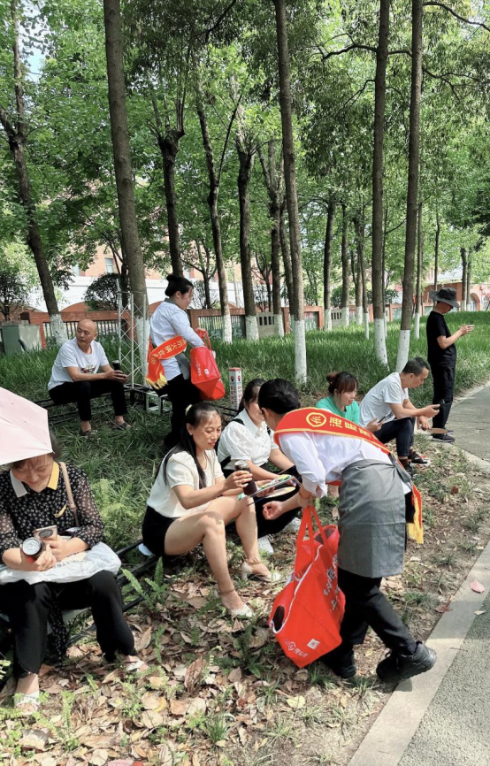 “天氣太熱了,喝點(diǎn)楊梅汁解解暑吧,祝您的孩子馬到功成,前程似錦!”在成都市新都中學(xué)高考考點(diǎn)門(mén)前,來(lái)自海底撈七一廣場(chǎng)店的志愿者員工們向等候的家長(zhǎng)送上清涼解暑的飲品和小扇子。