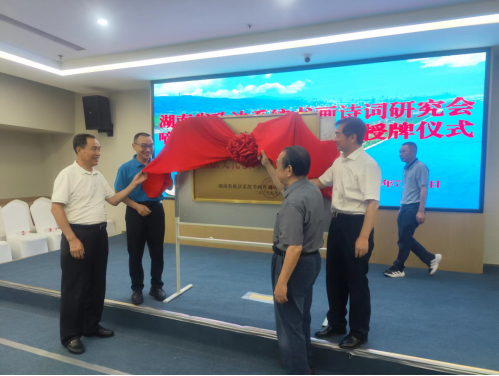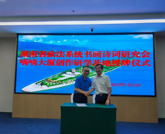 儀式現(xiàn)場,陳嶺主席與湖南嘀嘀大酒店董事長喻熟東簽約,標(biāo)志著“湖南省政法文化嘀嘀大廈創(chuàng)研基地”正式成立。隨后,在眾位嘉賓的共同見證下,彭對喜、劉慶富、陳嶺、喻熟東為創(chuàng)作研學(xué)基地揭牌。
