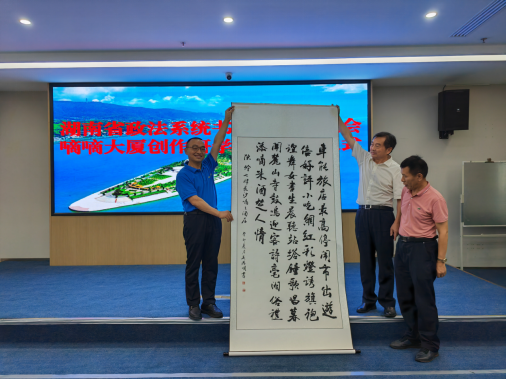 詩以言志,文以化人。以法護(hù)商,以商促文。7月15日上午,坐落于長沙市芙蓉區(qū)“中央文化區(qū)”的嘀嘀大廈五樓會議室高朋滿座,熱鬧非凡?!昂鲜≌ㄎ幕粥执髲B創(chuàng)研基地”簽約暨掛牌儀式在此隆重舉行。省政法系統(tǒng)書畫詩詞研究會主席團(tuán)成員彭對喜,副會長劉慶富;詩詞分會主席陳嶺及副主席賀曦、周加良、江世炎;書法分會主席陳祥松、副主席吳若順;長沙法官文聯(lián)副主席胡軍軍等領(lǐng)導(dǎo)和嘉賓出席活動。