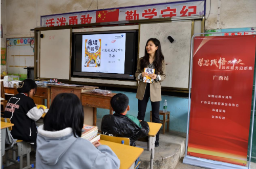 4月25日下午,“學(xué)思踐悟二十大 投教服務(wù)校園行”在浦北縣三合鎮(zhèn)橋頭小學(xué)開展。深交所、海通證券投教基地的專業(yè)人員深入各個班級進(jìn)行少兒財商授課,借助由深交所投資者服務(wù)部編著的《漫話大股市》,將專業(yè)的財經(jīng)內(nèi)容以通俗易懂的圖文形式傳授給小朋友們?!肮镜降资鞘裁?”“公司上市又是什么?”“有限責(zé)任公司與股份有限公司的區(qū)別在哪?”……一顆顆財商的種子在孩子們的心中生根發(fā)芽。