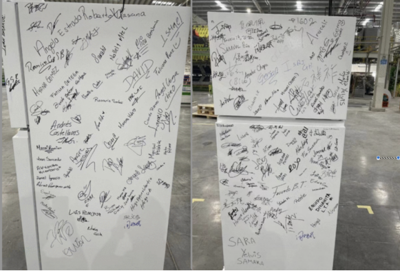 大家看到的這張照片,是今年8月19日,海信遠(yuǎn)在墨西哥的蒙特雷家電產(chǎn)業(yè)園下線的第一臺冰箱,這上面密密麻麻簽下了200多個由漢語、英語、西班牙語和韓語簽名,這些簽名來自于把原本一片荒涼的土地建設(shè)成占地達(dá)380畝的現(xiàn)代化制造工廠的建設(shè)者以及合作伙伴們,一個又一個的簽名代表著他們對產(chǎn)品質(zhì)量的確認(rèn)、對消費(fèi)者的承諾。蒙特雷工廠是海信全球29家制造基地中的一個,也是最艱難的一個,一年多來,我的同事們克服疫情、水源短缺與惡劣環(huán)境的影響,最終在一片一無所有的沙土地上高效完成了新工廠建設(shè)。目前這個制造基地已經(jīng)量產(chǎn)冰箱和烤爐產(chǎn)品,這將加速海信對北美和加勒比海地區(qū)市場的拓展。蒙特雷工廠的建設(shè)者,也讓我想起了2019年,為解決海信位于墨西哥蒂華納電視工廠的新項(xiàng)目施工試產(chǎn),我的同事白劍鋒帶領(lǐng)團(tuán)隊(duì)租住在工廠對面,確保24小時“隨叫隨到”,當(dāng)?shù)貙懼?4小時營業(yè)的便利店實(shí)際也只服務(wù)18個小時,而海信員工卻始終做到24小時隨時待命支持項(xiàng)目,這種極度的勤奮與敬業(yè),就連工廠門衛(wèi)都忍不住感嘆“中國人太crazy”。