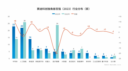 賽迪科創(chuàng)獨角獸百強(2023)在新材料行業(yè)實現(xiàn)新突破,受益于我國新能源汽車市場爆發(fā),帶動上游鋰電池正極材料、電解液、隔膜等需求加速釋放,有3家新材料行業(yè)企業(yè)首次入圍獨角獸百強,分別是融通高科、福建德爾、先導薄膜;同時,獨角獸百強前10名中新能源及新能源汽車行業(yè)獨占5席,排名均在前六名。從數(shù)量分布看,半導體、人工智能、新能源行業(yè)分布數(shù)量位列前三,上榜企業(yè)數(shù)量分別達到23家、22家、14家,其中,半導體與新能源行業(yè)上榜企業(yè)數(shù)量增長最多,分別增加9家和8家,成為最熱門賽道。