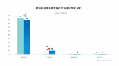 地區(qū)層面,賽迪科創(chuàng)獨角獸百強(2023)分布不平衡態(tài)勢依然突出,東部地區(qū)占88家,中部地區(qū)占10家、西部地區(qū)占1家,東北地區(qū)占1家,與上一年相比,中部地區(qū)增長最多,增加8家,東部地區(qū)則有所降低,但仍處于絕對領(lǐng)先地位。